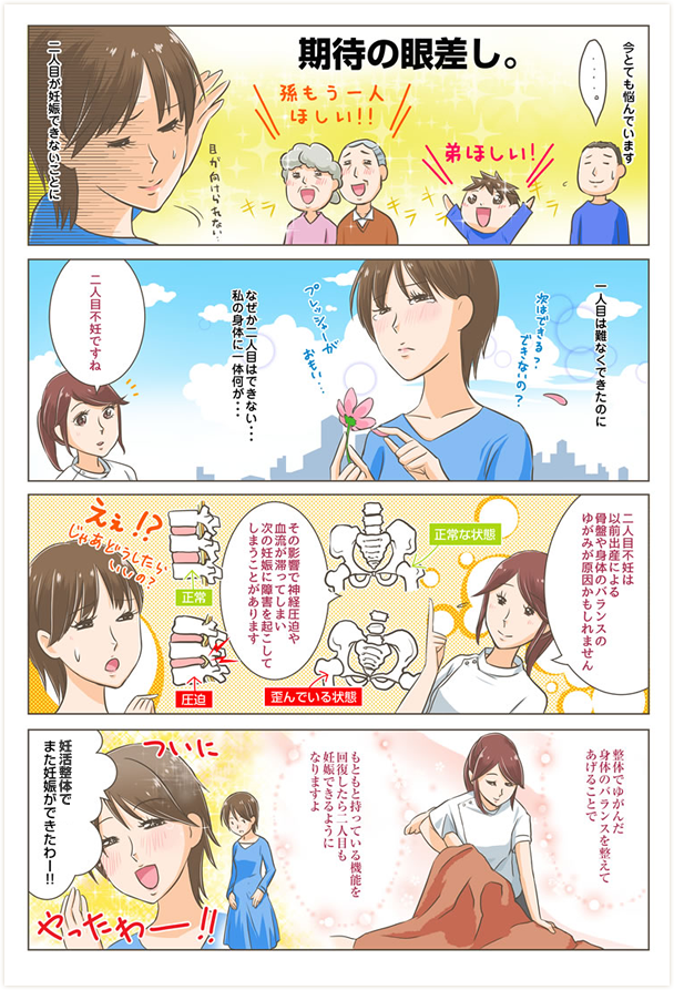 一人目を出産して2年以上たっていたのですが、そろそろ2人目を・・・と相談して妊活骨盤矯正に切り替えてもらってからすぐ妊活に入り、アドバイス通りのタイミングで2人目を授かることができました。